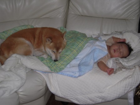 孫娘のお昼寝に愛犬ハチが足を枕にお昼寝、そのうちおなかも枕にしそう。