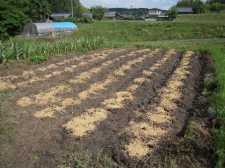 今日はししとう150本、茄子80本を植え籾殻をまき、トマトの枝木をさして手にしてきました。