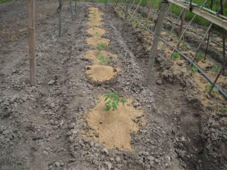温室で育てたトマトの苗と、ゴーヤの苗を植えつけました。