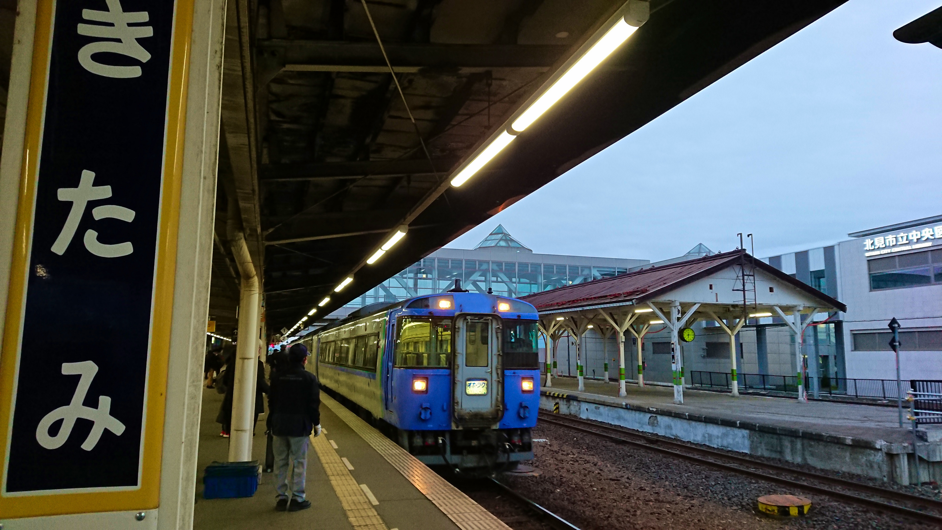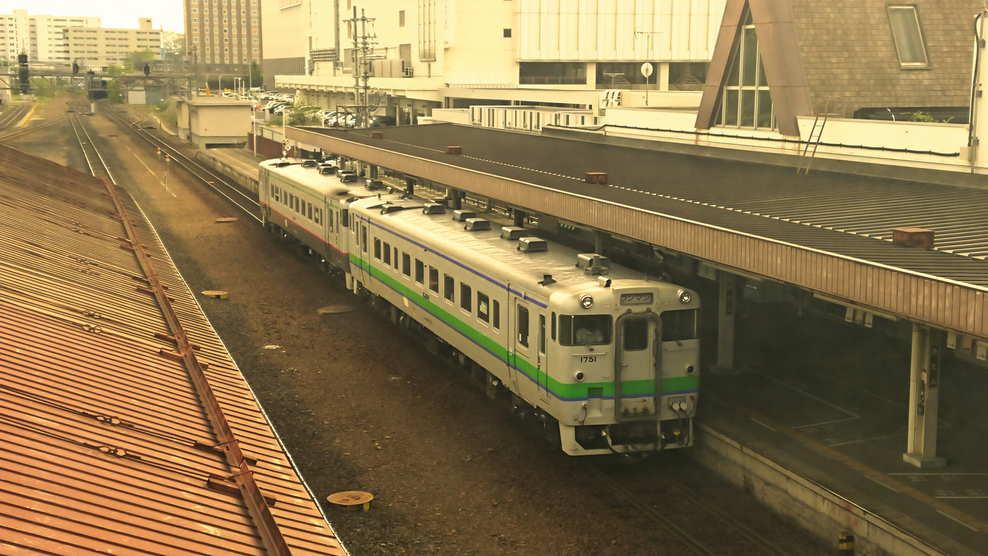 北の大地でつかの間の運転士になる夢を叶えた私は、次なる目的「日本最北端を目指す」を果たすべく、まずは北見行のバスに乗った。北見からは石北本線で当日の宿泊地旭川を目指す。北見市は初めてであったが、人口は約10万8千人の道東の中心都市、面積は道内一の広さらしい。駅周辺はホテルやデパートがあり想像よりずいぶん都市集積があった。カーリング女子で有名になったロコ・ソラーレの本拠地というのも初めて知った。 さて、北見駅も構内が広く、貨物ターミナルも併設している。有名なタマネギ列車こと石北貨物もここから発車する。私が乗るのは網走発札幌行の特急オホーツクで、使用車両はキハ183系国鉄特急型気動車だ。今は新系列の車両に置き換わっているが、当時は置き換え前で、最後に乗車できたことは幸運だった。ただし、北見発が日没前だったため、車窓を楽しめたのは峠越えが始まる区間までで、勇壮な景観を堪能することは叶わなかった。それでも、重厚なディーゼルサウンドを奏でながら峠に挑む様子は車内から充分感じることはできた。 そういえば、北海道のローカル列車で定番だったキハ40系も、この時すでに数を減らしつつある時期で、石北本線や宗谷本線では見かけたものの、JR北海道が新たに導入した電気式気動車H100型が幅を利かせつつあったのが印象的だった。今回の旅では、北海道に残る旧国鉄の残り香を感じる最後のタイミングだったのかも知れない。そんなことを考えながら、翌日の宗谷本線の旅に備えるべく今宵は旭川駅前に投宿した。 ※画像左=北見駅に入線するキハ183系特急オホーツク、画像右=石北本線のローカル運用に就くキハ40系気動車(2両目は急行宗谷色) |