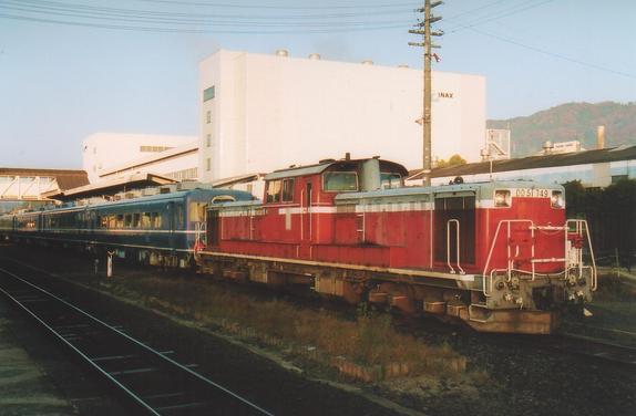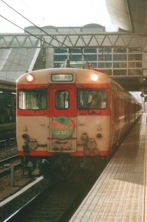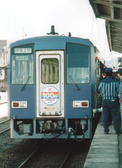 2回目に参加したミステリー列車は平成14年の秋で、行き先は鳥羽でした。多くの参加者が当然ながら行き先を知らされない中で、私は鉄道写真愛好家向けの月刊誌「鉄道ダイヤ情報」により、行き先、運行ダイヤ、車両運用を事前に知ることが出来ました。勿論、子供には内緒にしていました。経路は伊賀上野から亀山、多気を経由し鳥羽を目指すルートで、使用された車両はJR東海所属のDD51と特急型客車の14系6両という編成でした。この組み合わせも非常に貴重なもので、JR東海の14系客車は今や廃車ないし他社への譲渡によって全てなくなってしまっています。当日もこの列車を撮影するカメラマンの姿が沿線のあちこちで見受けられ、参宮線の有名な撮影地ではSL列車か、はたまたお召し列車でも来るのかと言わんばかりの鈴なりの人手で、同乗した子供や親御さん達もビックリした様子でした。ついに主催者側から「この列車はとても珍しい列車ですよ」と言った案内放送がされた程でした。伊賀から鳥羽への常套手段は勿論近鉄ということになります。特急なら伊賀神戸から約1時間で行けるところを、3時間かけてゆっくりと進みました。しかし、子供達の学習の場としてはこれで丁度良い時間ですし、スローな旅の良さを感じた大人も少なからず居たのではないかと思いました。 そんな旅を体験できるのもJRならでは、ではないでしょうか。 画像=伊賀上野駅で発車を待つミステリー列車。この時はヘッドマークの装着はありませんでした。 |