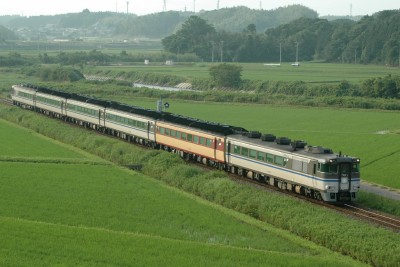関西本線非電化区間を走破する、国鉄特急型気動車(181系)による春の修学旅行集約臨時列車ですが、いよいよ運転が終盤になってきました。5月上旬から約1ヶ月間、兵庫県内の小学生を奈良、伊勢志摩へ運んできました。一体、何人の子供達がこの列車で思い出づくりをしたのでしょうか。今日も、そんな列車の姿を追いかけてきました。撮影地では、私以外にも同じ思いでカメラを構える方とよく出会います。何度も一緒に出掛けている方、初めてお会いする方、列車を待つ間、そんな人達と色んな情報を交換しながら談笑するのもまた楽しいものです。 余談ですが、その昔、姫路と鳥羽を結んだ姫路(鳥羽)快速という列車があったのをご存知でしょうか?山陽、東海道、草津、関西、紀勢、参宮線を経由する蒸気機関車牽引の快速列車です。勿論、難所の加太峠は後ろにも機関車をつけて越えました。その後押しした機関車が休息をとった機関区が柘植駅の構内はずれにあった柘植機関支区です。今は草が生えて当時を偲ぶものはありませんが立派なターンテーブルも備え、柘植駅は大いに活気づいていたそうです。そんな柘植駅を中継点にかつての姫路快速と同じルートをこの列車が辿っていきます。 画像 左上=田植えの終わった田園風景を行く。(新堂〜佐那具)中上=こちらは紀勢本線でのショット。2両目は珍しい国鉄特急色の車両です。(一身田付近)右上=柘植から草津線へ入り帰路につきます。(柘植)左=昔ながらのレンガ積みトンネルを抜ける。(関〜加太) |