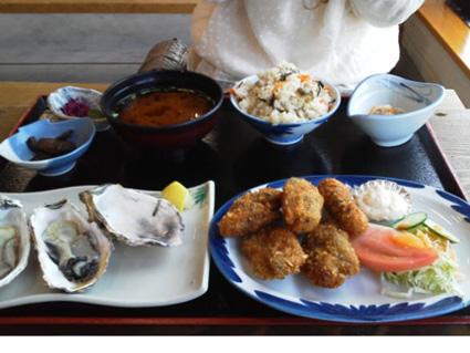 焼き牡蠣5p(左写真)生牡蠣3p、牡蠣フライ5p、牡蠣ご飯、牡蠣のマリネ、牡蠣の佃煮、味噌汁(中央写真)であります。(牡蠣定食1800円) ん〜やっぱ産地で食べる牡蠣は臭みが無くてレモンなん無くても つるん と入っていきます。 与吉屋では焼き牡蠣食べ放題もありますが コノ位がちょうどいいですね。浦村の湾も一望できて もうすべてが美味でした。(牡蠣フライがちょっと固かったかな 揚げすぎかも)