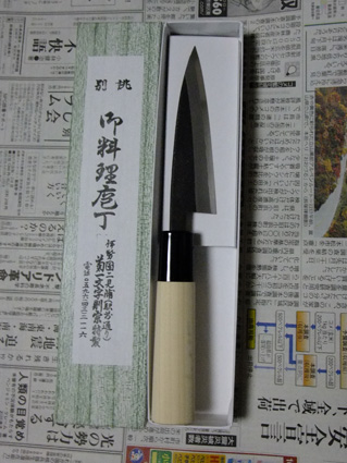 ゲットいたしました。(右写真) 菊一文字と言えば新撰組の沖田総司の愛刀ととの噂があるほどの名刀 しかし菊一文字を名乗る名工は京都 奈良 伊勢…(詳細は不明) お店のご主人にチョイスして頂き 細身の小出刃を購入 研ぎ方もレクチャして頂き ありがとうございました。 |