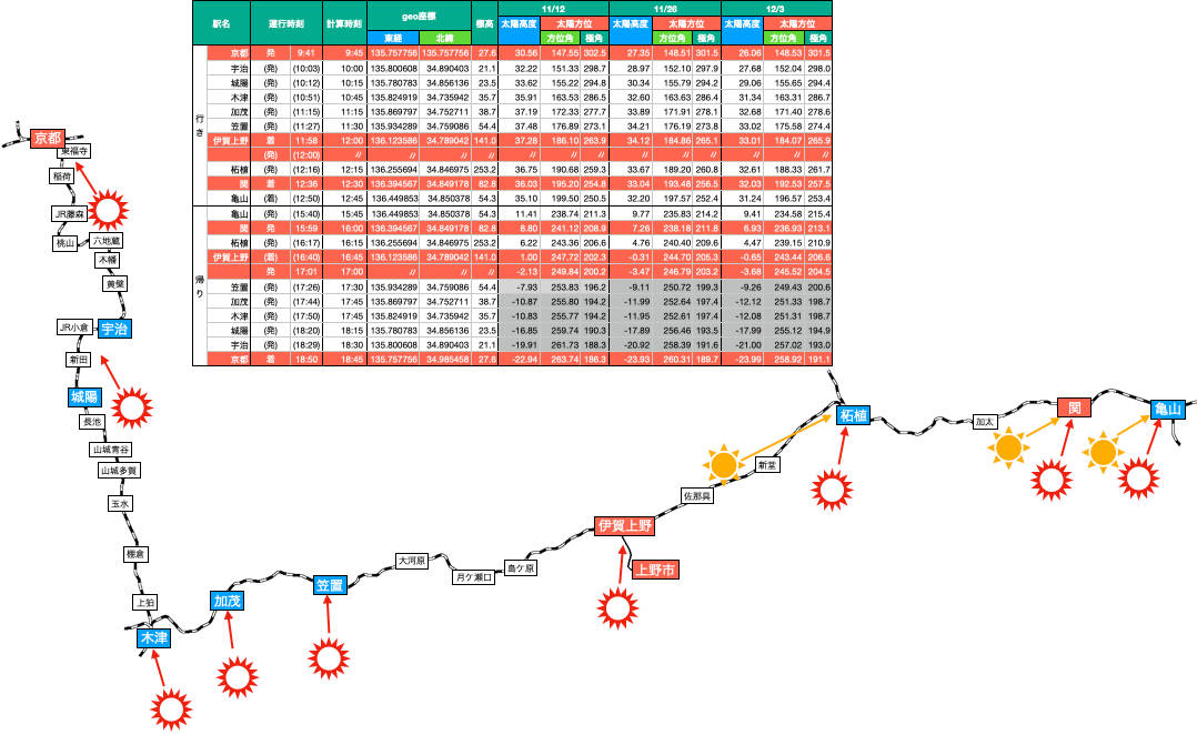 中) Ke!san(高精度計算サイト)の太陽高度(一日の変化)で、主要駅の着発(通過)時刻の太陽方位と高度を計算して一覧を作成。グレー地は、高度がマイナスになる日没以降。沿線マップに、行きは赤色、帰りはオレンジ色の矢印で、太陽からの向きを表示した。