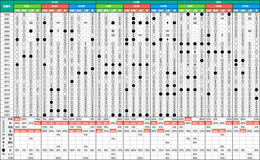 右) 気象庁の過去の気象データ検索から、運行日の京都、奈良、上野、津の過去25年間の天気一覧を作成。赤地に白文字が回数が多かった天気の占有率。季節的に(快)晴か曇の傾向が見られた。本日の2週間天気で初日は、以上各地とも、晴時々雨の予報のようだ。