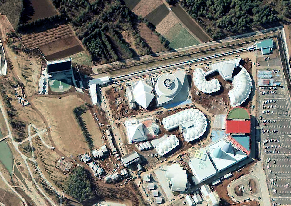 中) つくば科学万博開幕の82日前。左上がジャンボトロン、上部を左右方向に走るのがHSST試乗線、右上がアメリカ館、カラフルな屋根は東芝館。