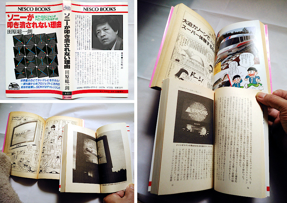 右) Webで、当時の写真を探すと、田原総一郎さん著の如何にも過激な書籍名の「ソニーが叩き潰されない理由」が合わせて出てきた。たしか本棚に残っていたな、と再び手に取って読み返すと、ジャンボトロン開発秘話をまとめた内容だった。VTRやCRTが姿を消した現在、伝説の「