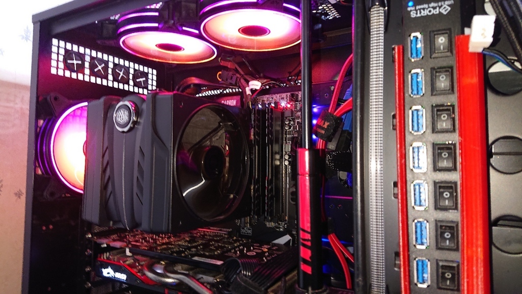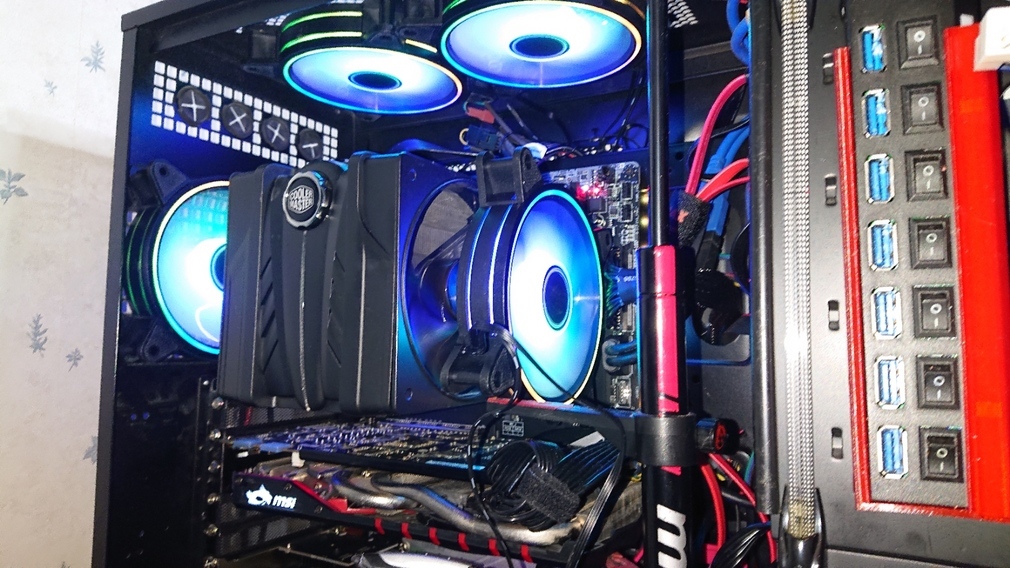 上部に2機 背面に1機 フロント下部に1機 右側面カバーにも1機の5機を固定しました