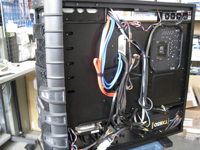 裏配線してサイドパネルを閉じた状態で内部から配線の微調整をしています。