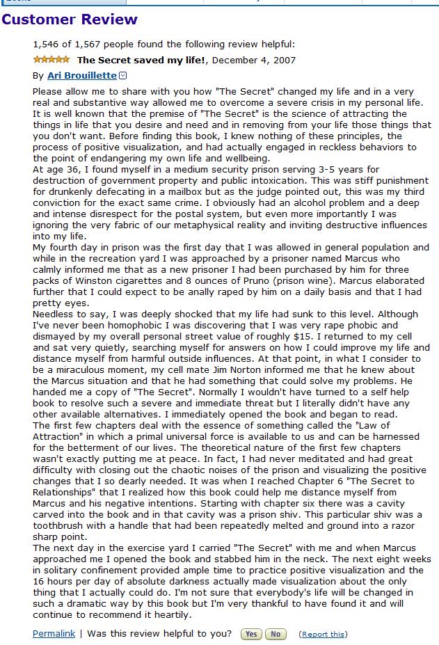 Digg - The Secret Saved My Life! [Hilarious Amazon Review]より