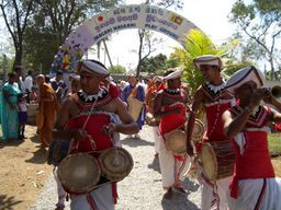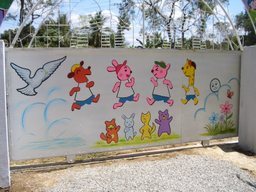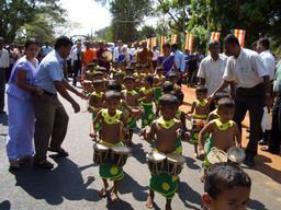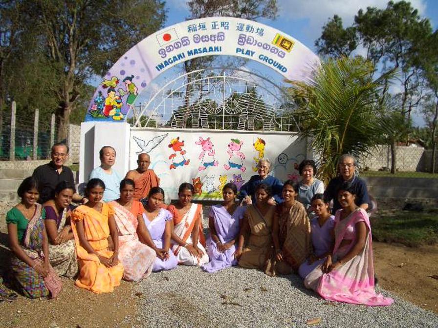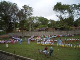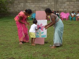 保母さんも園児も芝生の上を裸足で、ゲーム