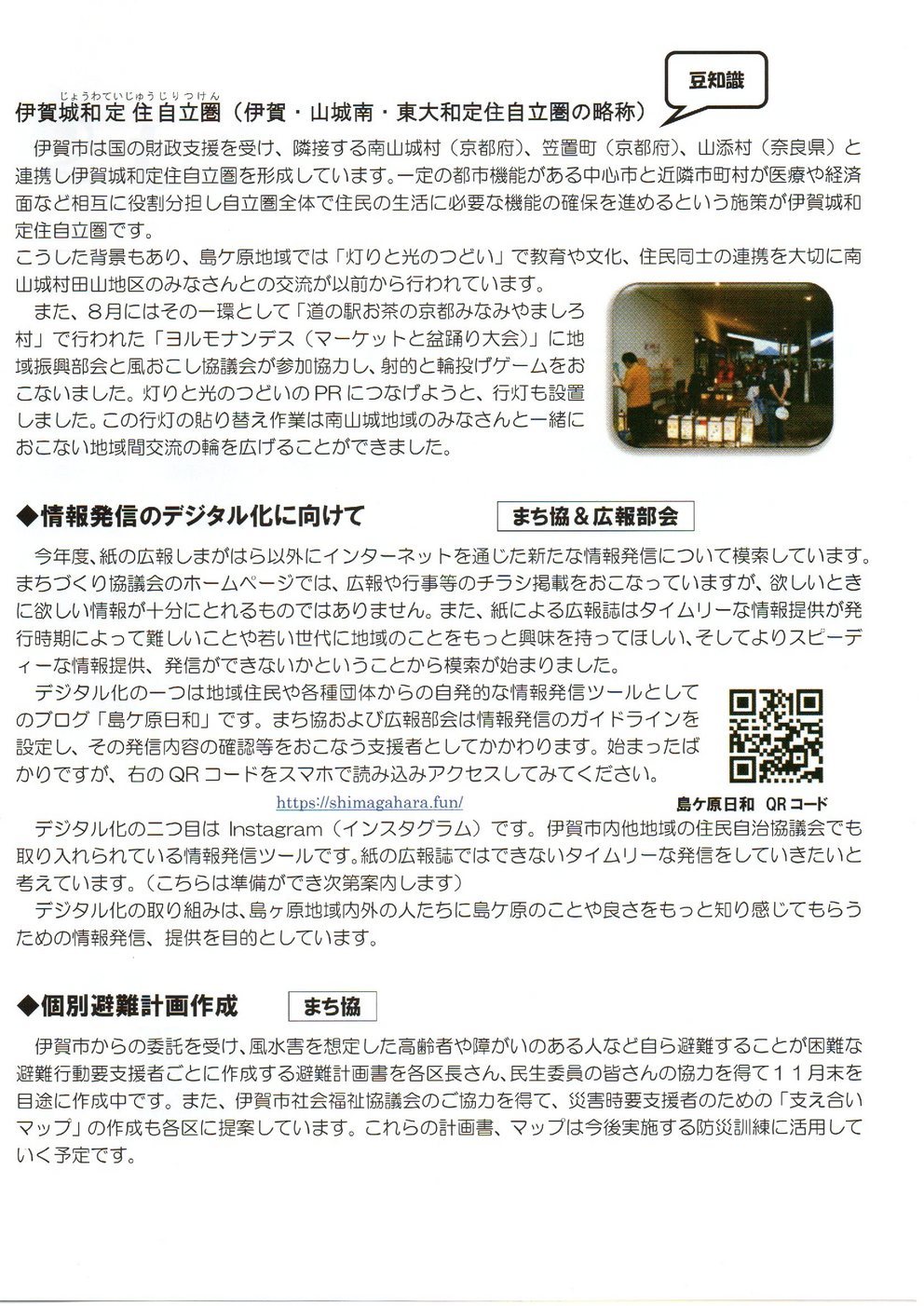 平成17年3月12日発足 島ヶ原地域住民を主体とする自立と協働により、日頃の住民参加によって地域的な合意に努めつつ、地域の活性化及び住民の安全・安心、文化向上に必要かつ効果的な事業を行い、福祉の増進と自然を活かした明るく住みよいまちづくりを推進することを目的とする。