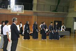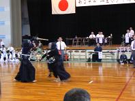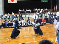 この大会は、団体戦の各チーム緒戦は、基本判定試合(切返し)と1本勝負の2試合によって、構成されています。要は、団体戦5人で試合の場合、両チームそれぞれ切返しの判定を先鋒、次峰・・・と進めていきます。全員がお相手より切返しがすばらしいと5対0となります。次に1本勝負を先鋒、次峰・・・とすすめて、もし全員が負けたら、合計5対5。代表者戦となります。
